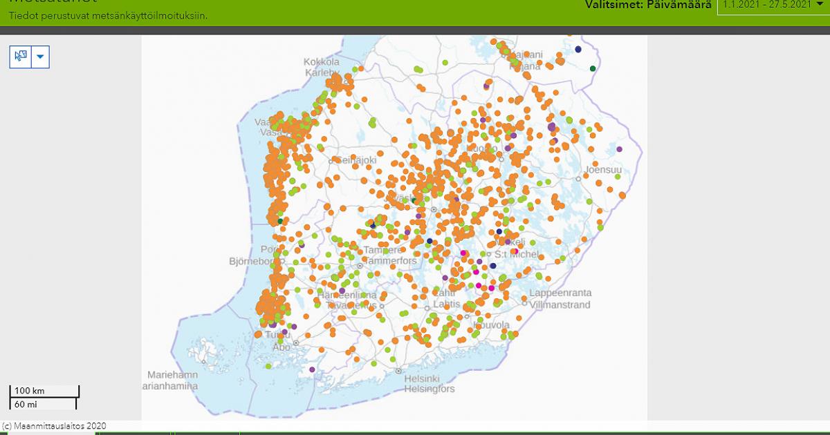 I Finlands skogscentrals nya karttjänst visas anmälda avverkningar som görs på grund av skogsskador. På kartan syns avverkningar som planeras på grund av djur-, insekts-, snö-, storm- och svampskador, och för vilka anmälan om användning av skog lämnats in.