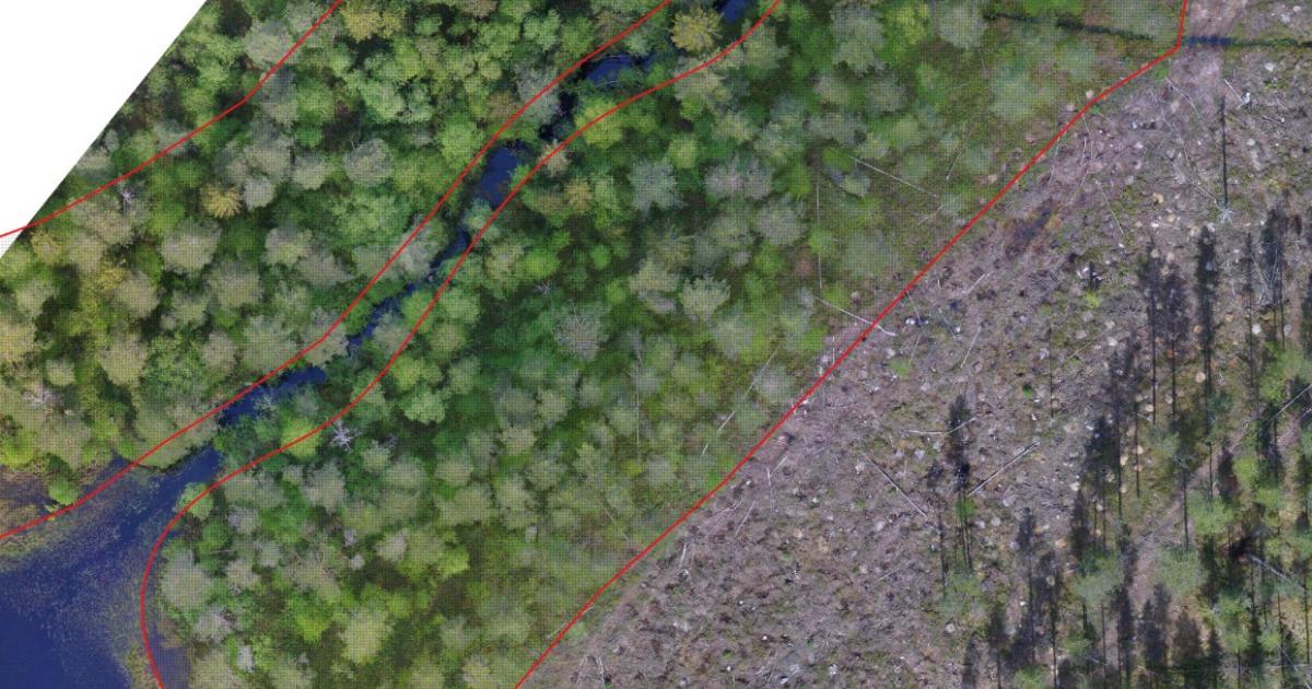Drönarbilden visar ett skogslagobjekt – en närmiljö kring en bäck – på vars sydöstra sida avverkning har utförts. De röda linjerna visar skogslagsobjektets gränser. Med drönare har man övervakat huruvida avverkningen har gått ut över skogslagsobjektets område.