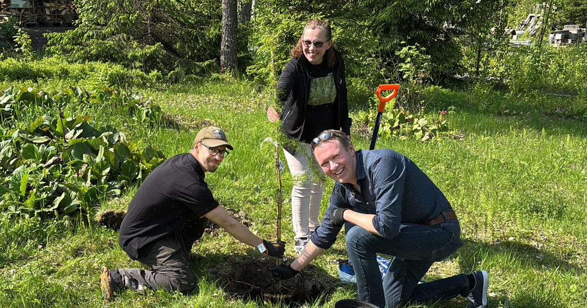 Roope Tonteri vann Pro skog-priset i Sydöstra Finland år 2025. Tonteri planterade pristrädet tillsammans med Riitta Torikka, ordförande för Sydöstra Finlands skogsråd och Ilpo Rautio, näringschef vid Skogscentralen. Bild: Arto Pulkkinen