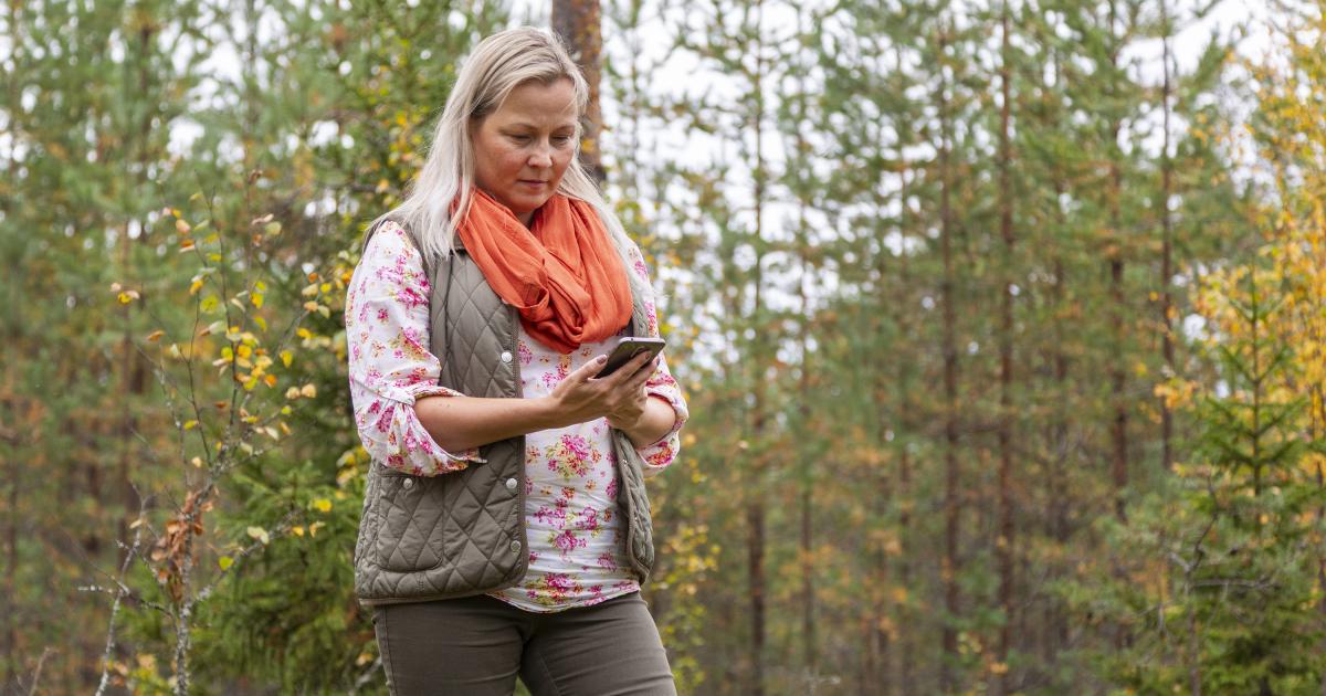 Skogsägare kan använda den förnyade tjänsten MinSkog.fi med en mobil enhet ute i den egna skogen för att kontrollera hur uppgifter om beståndet, naturobjekt och skogsvårdsförslag som anges i tjänsten ser ut på i terrängen.
