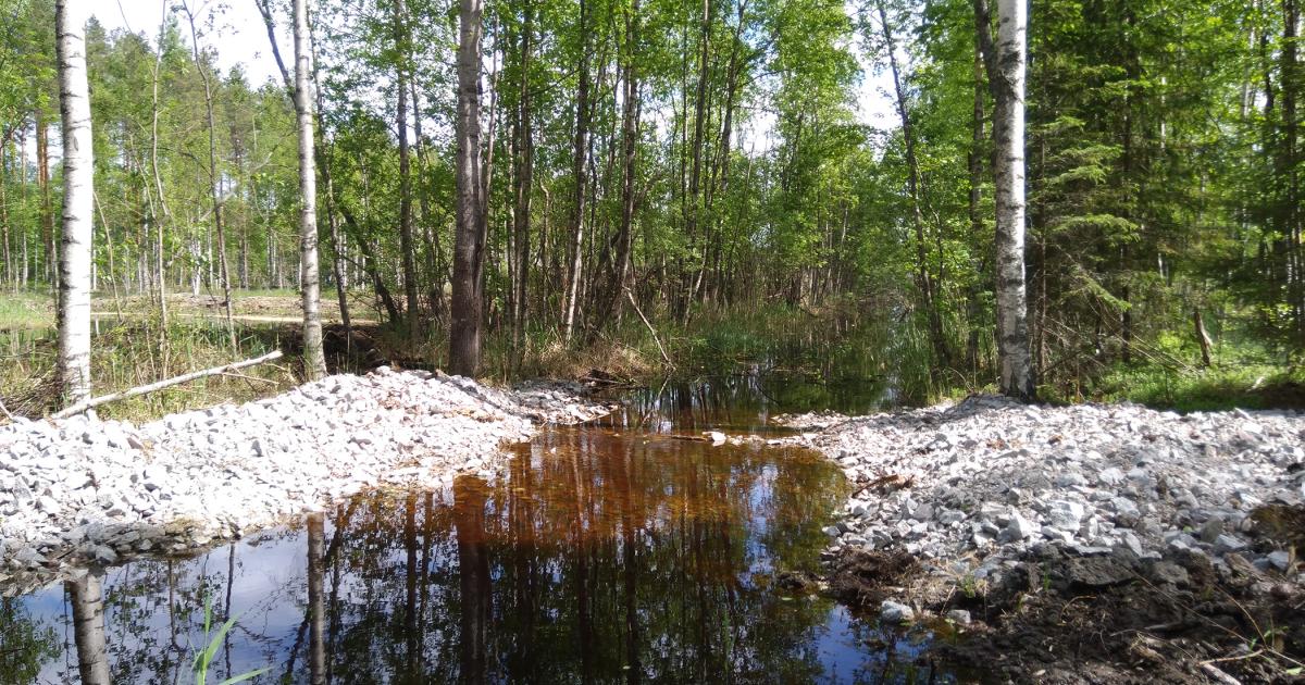 Den nya ordlistan innehåller termer och definitioner kring vatten och diken. Här syns en bottendamm i ett utfallsdike från en våtmark. Foto: Marjo Ahola.